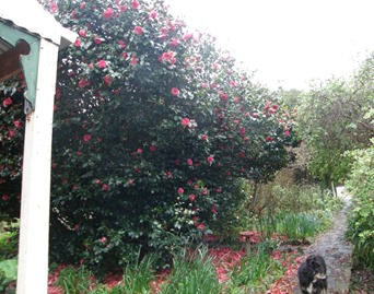 But also the usefulness of the fallen petals.The ones falling on the surrounding footpaths are raked up and used as mulch. All that fall around the tree are left to be turned ,with the help of biodynamic preparations into top quality humus. Over the 30 years we have been here the camellias have never needed fertilizer and have only been watered in times of extreme drought , mainly to prevent the house cracking! The tree grows so well it needs pruning with a chainsaw to prevented it growing over, and crashing on the veranda.